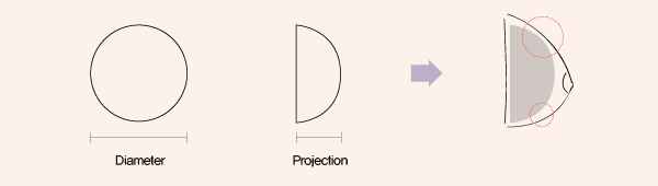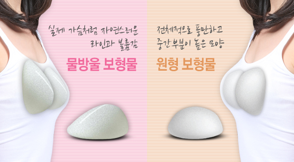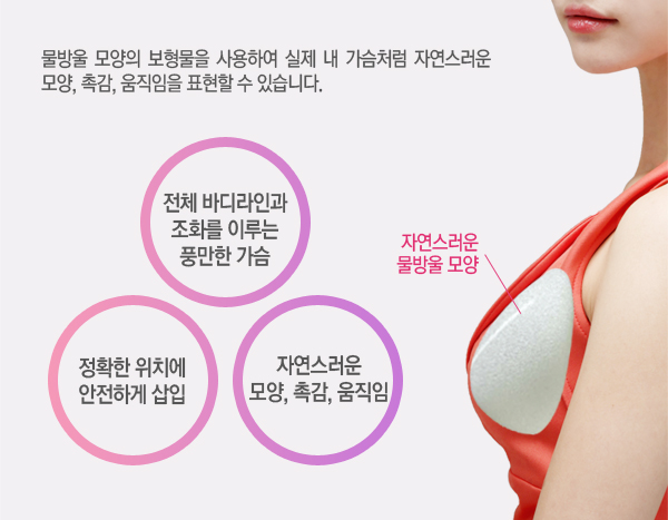| 원형 보형물과 달리 수술 후 보형물과 유방 내 공간의 형태에서 뜨는 공간이 적기 때문에 보형물의 위치 변형 등의 부작용이 적습니다. |