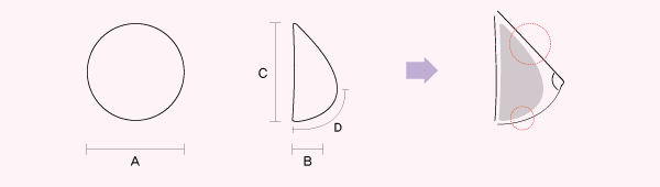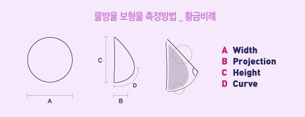 | 유륜(Areola)의 올바른 위치와 유방밑 주름(Inframammary fold) 사이의 상관관계를 나타내며 보형물에 추가적으로 D를 측정 함으로서 최적화된 해부학적 모양의 설계를 가능하게 합니다. |