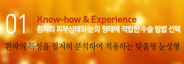 | 눈 성형시 개인의 얼굴에 가장 잘 어울리면서 자연스러운 눈매를 만들기 위해선 환자의 피부상태와 본인이 가지고 있는 눈의 장점과 단점을 철저히 분석해서 가장 적절한 수술방법을 찾아 얼굴에 맞는 맞춤형 눈성형을 하는 것이 중요합니다. |