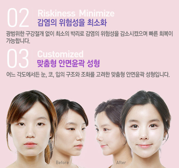 | 본 병원에서는 기존의 구강내와 안면절개를 통해 뼈를 절단하는 것이 아닌 특수기계를 이용하여 최소절개의 미세박리로 윤곽교정수술을 진행하므로 부작용은 최소화 시키고 보다 만족스러운 경과를 드립니다. |