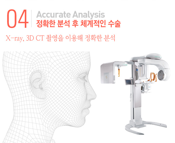 | X-ray, 3D CT 촬영을 통해 정확한 분석 후 체계적인 수술을 통해 부작용을 최소화 합니다. |