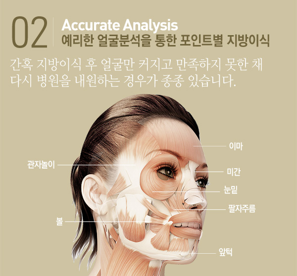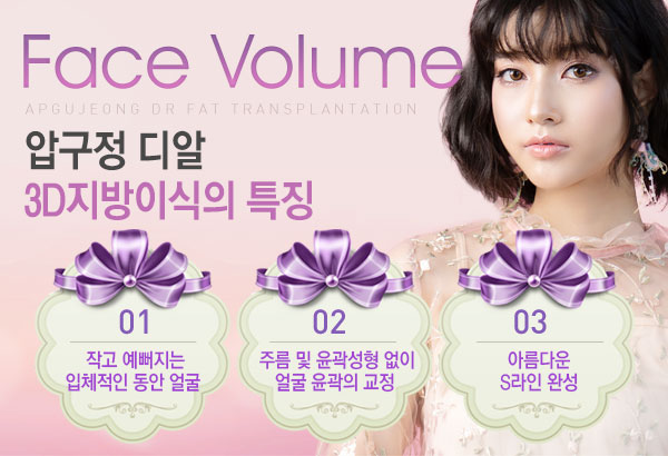 | 압구정 디알 3D지방이식은 개인별 얼굴 형태와 해부학적 구조에 따라 얼굴분석을 통한 포인트별 지방을 이동, 투입, 재배치하여 지방이식의 선두주자가 되었습니다. |